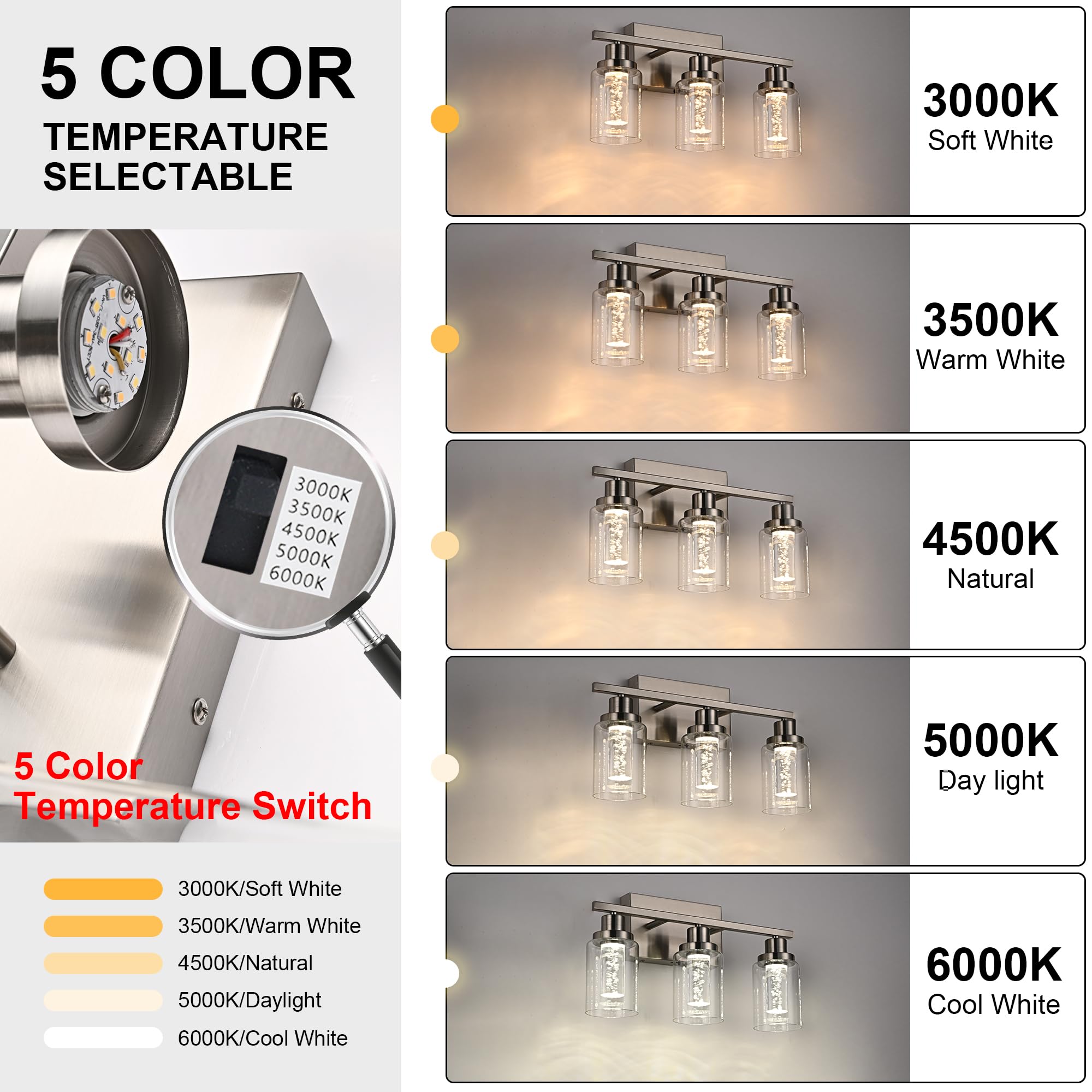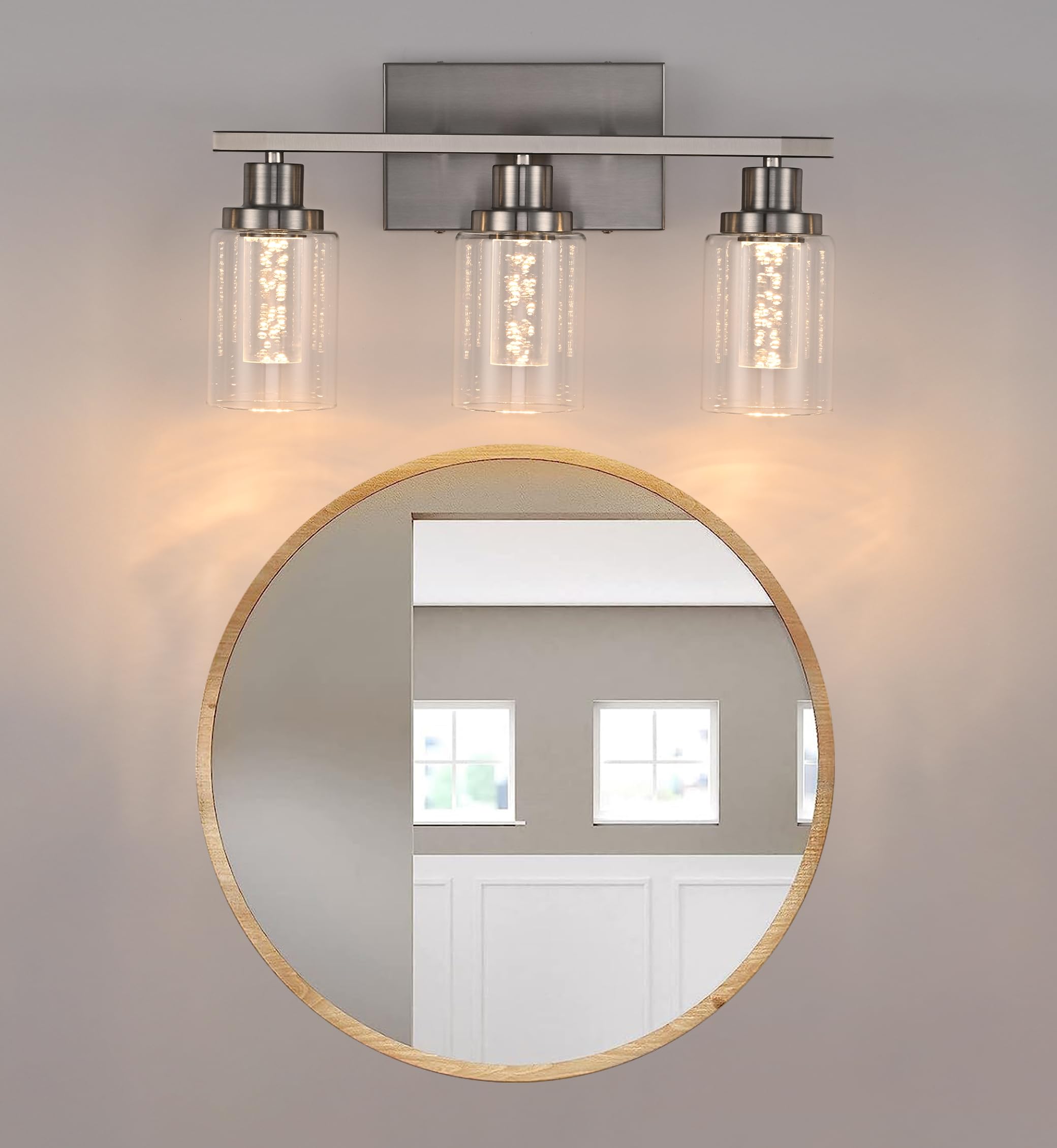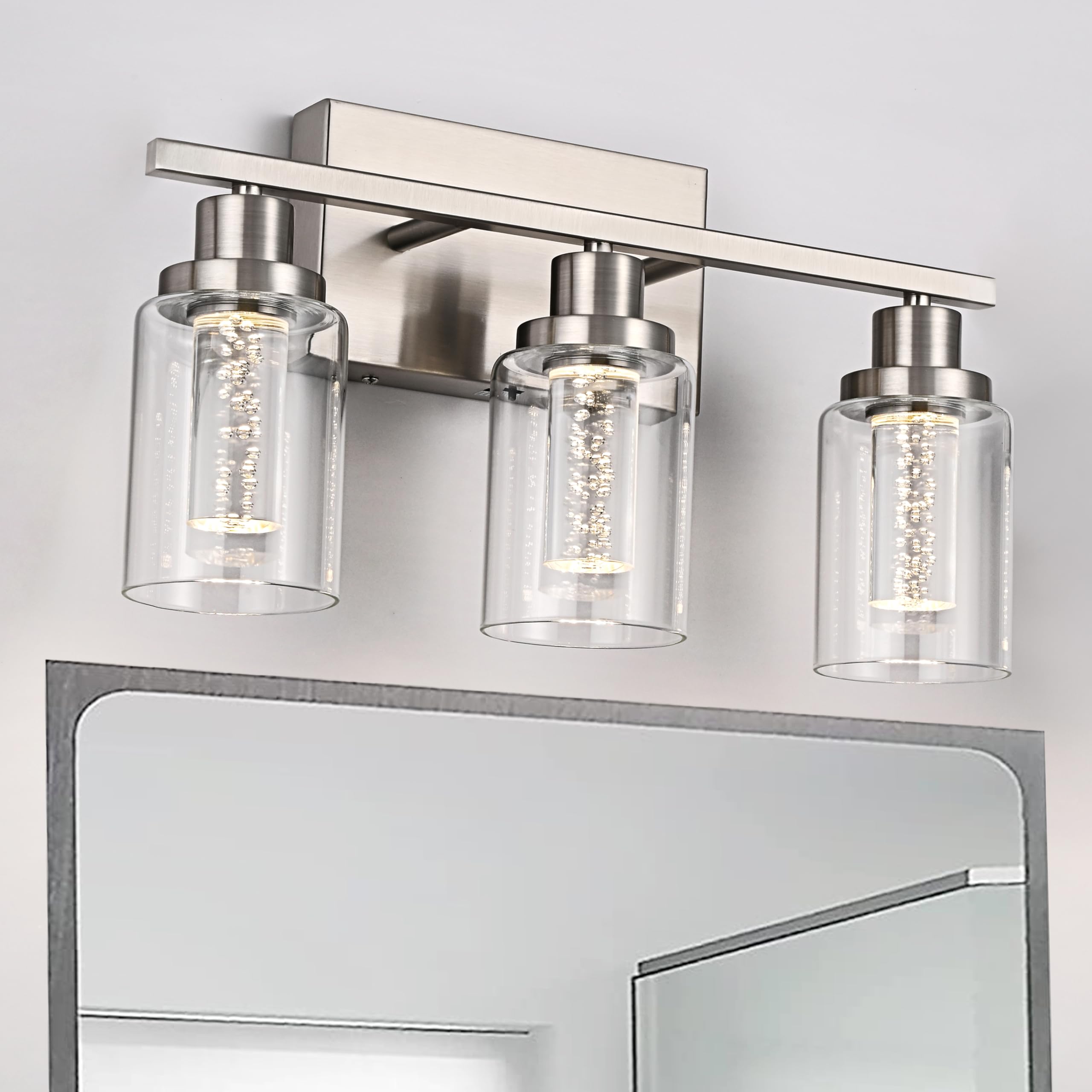 MELUCEE 3 Light LED Bathroom Light Fixtures 3000K-6000K Dimmable Vanity Lights Bathroom Lights Over Mirror Brushed Nickel Wall Light Fixture with Crystal Bubble Clear Glass Shade, Built-in LED Chips