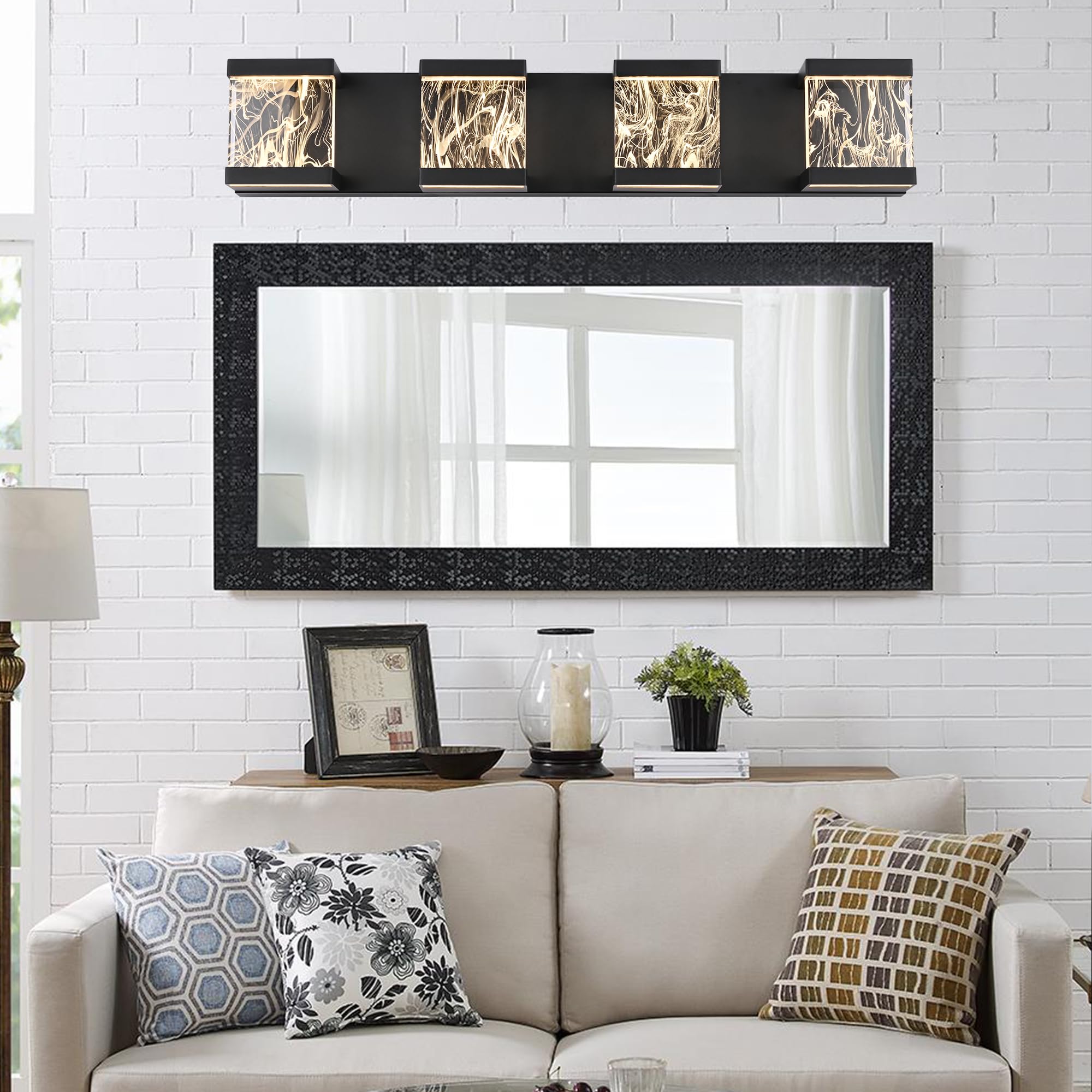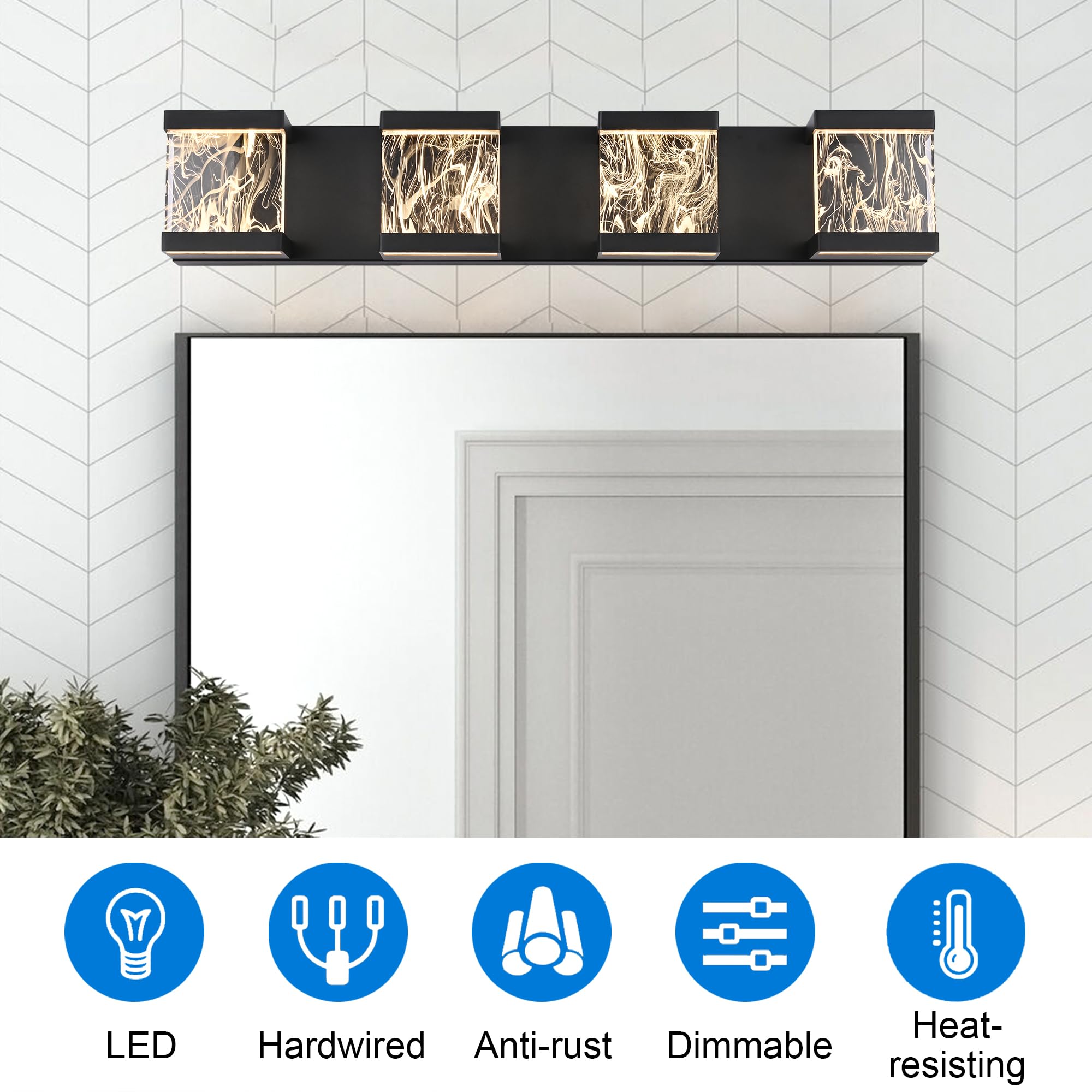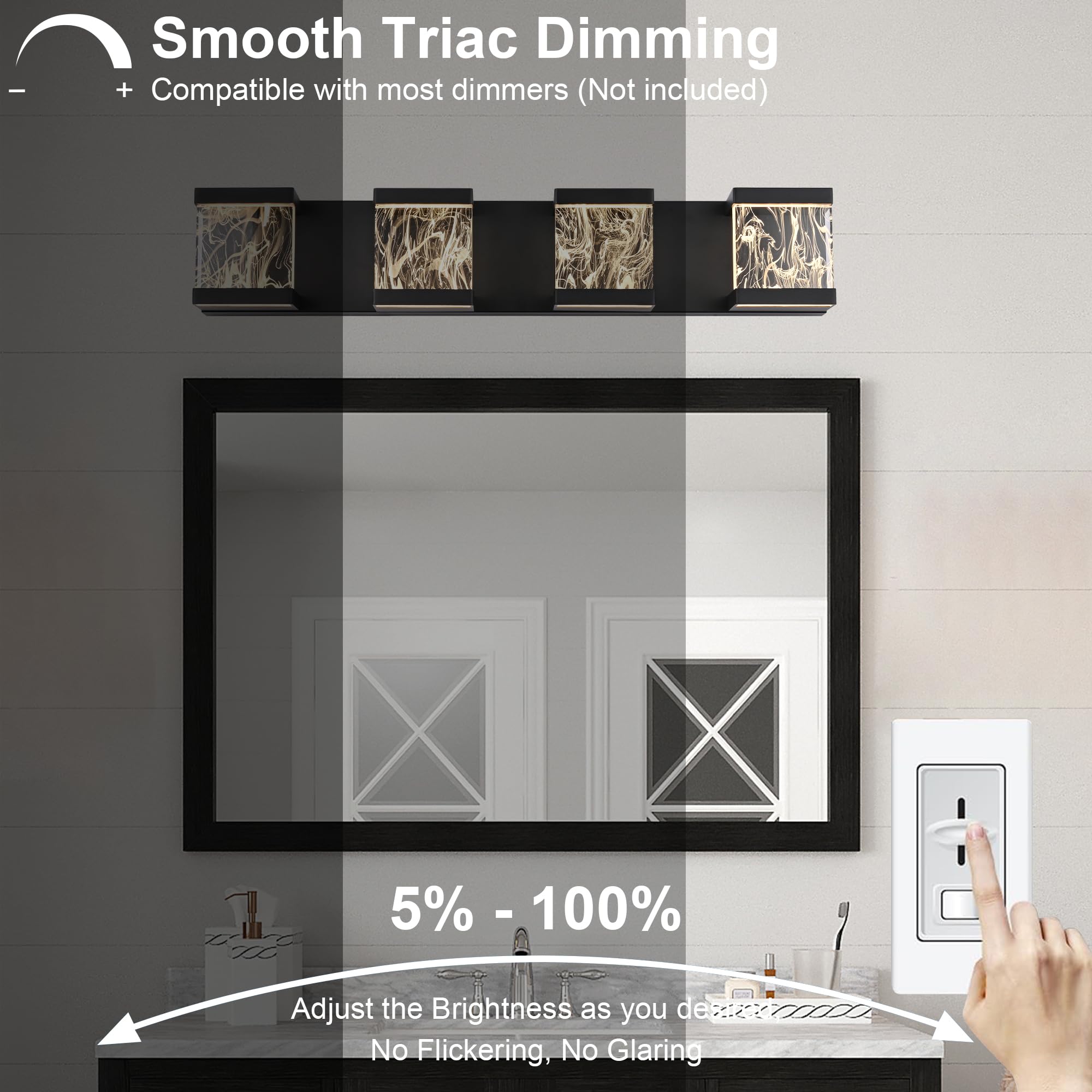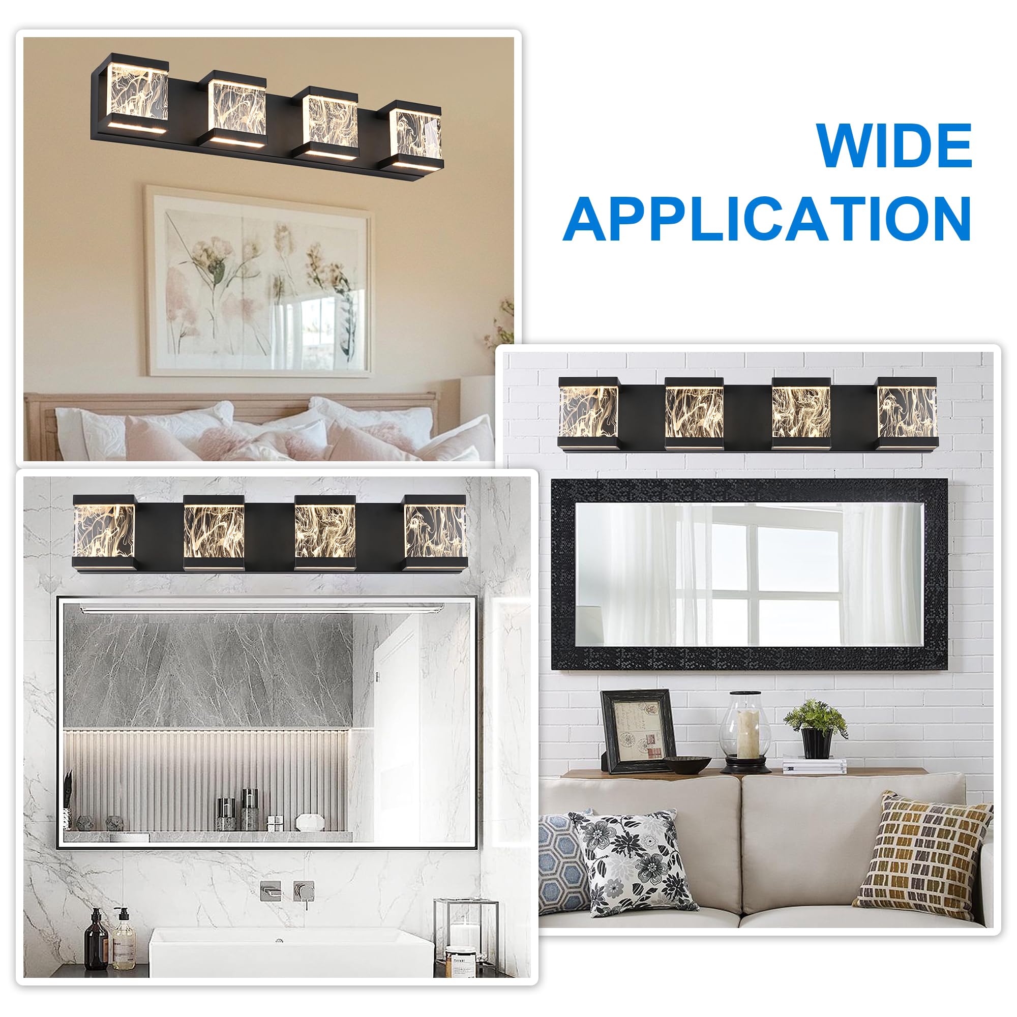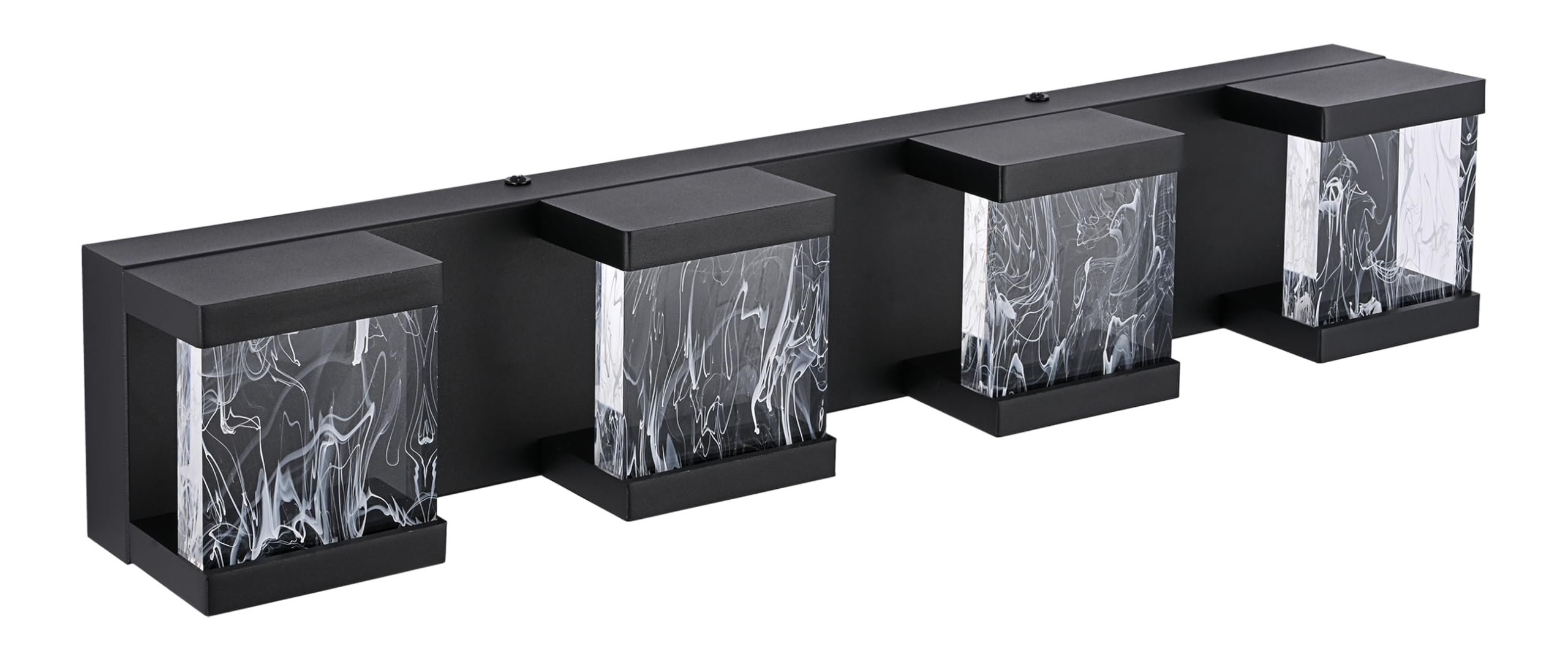 MELUCEE 4 Lights LED Bathroom Vanity Light with Unique Smoke Acrylic Panel Modern Vanity Lighting Black Bathroom Light Fixtures Wall Sconce for Bath Powder Room Entryway, 20W 3000K Warm Lighting