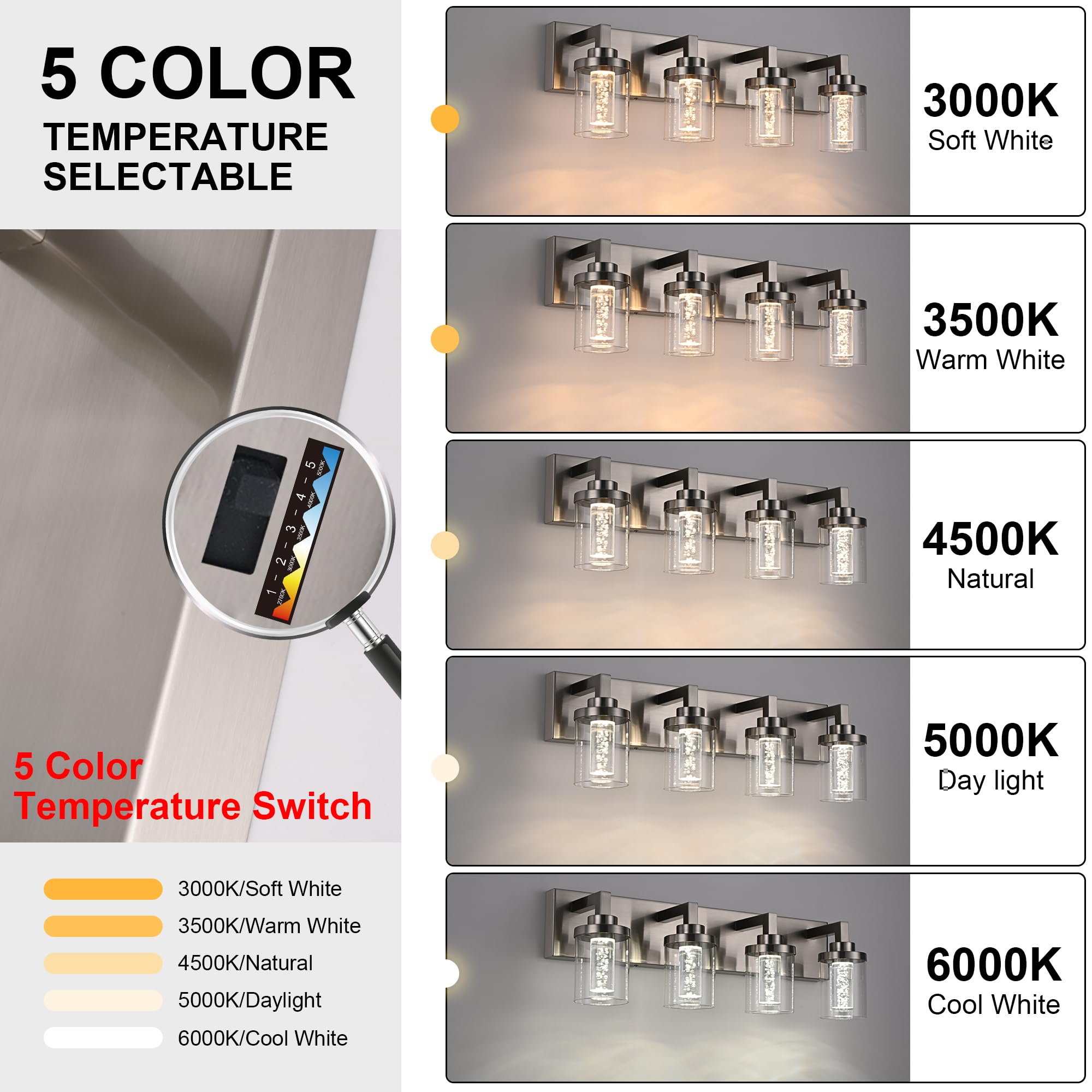 - 5 Color Temperature Adjustable: This dimmable led vanity light comes with 5 color temperature: 6000K cool light, 5000K daylight, 4500K neutral light, 3500K warm light, 3000K soft light. Compared with single color, this led wall sconce is more practical. Experience the perfect blend of efficiency and customizable lighting for all your needs
