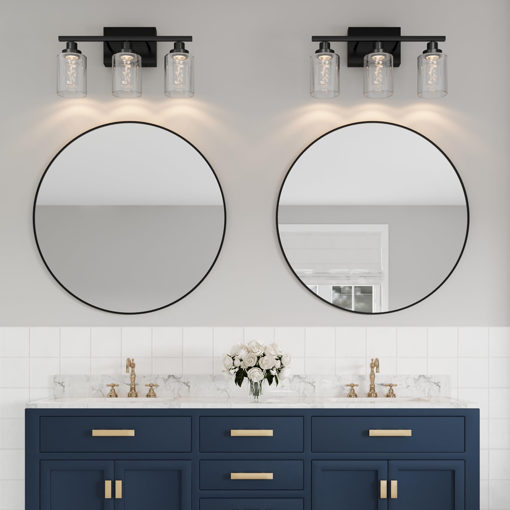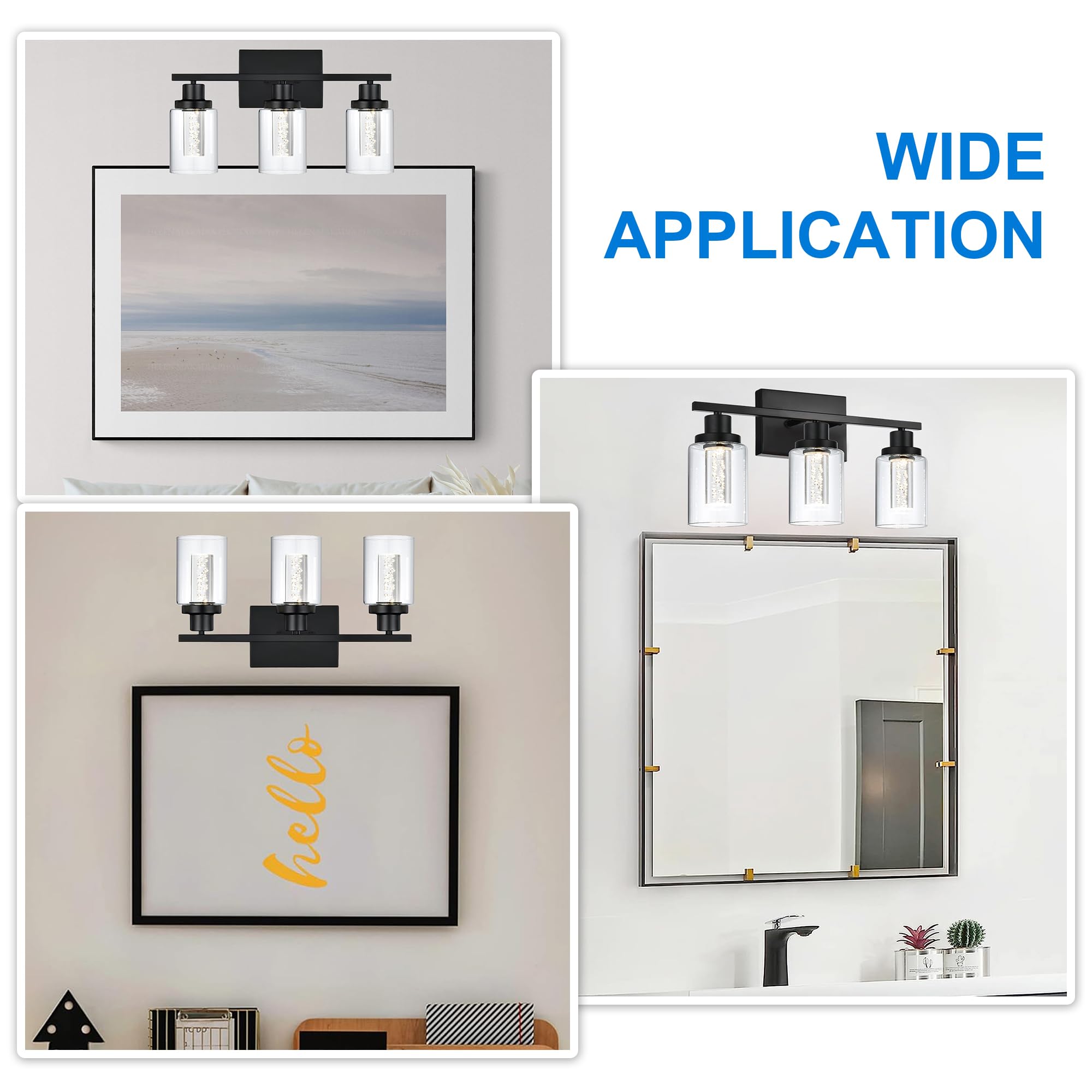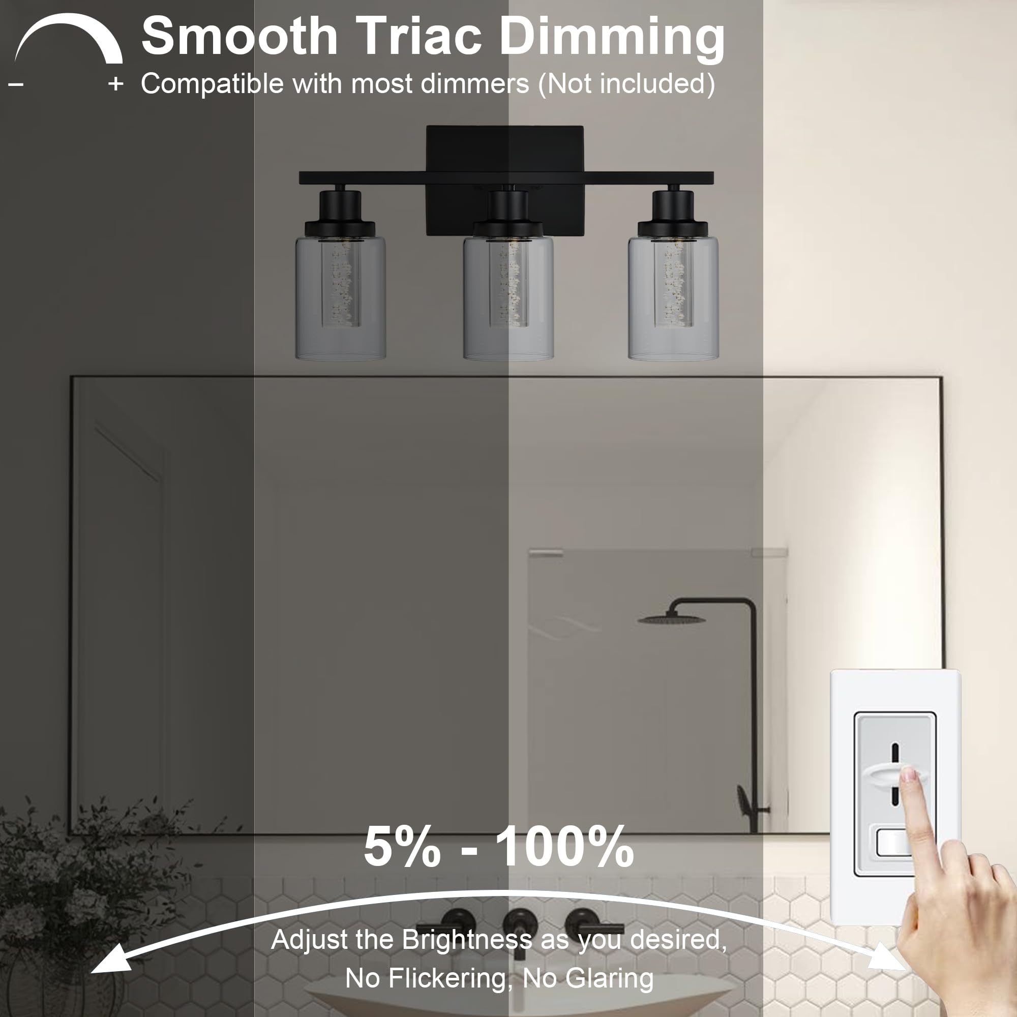 MELUCEE Bathroom Vanity Light Fixtures, 3-Light LED Bathroom Lighting Fixtures Over Mirror, 3000K-6000K Modern Black Vanity Light for Bathroom with Crystal Bubble Glass Shade, Built-in LED Chips