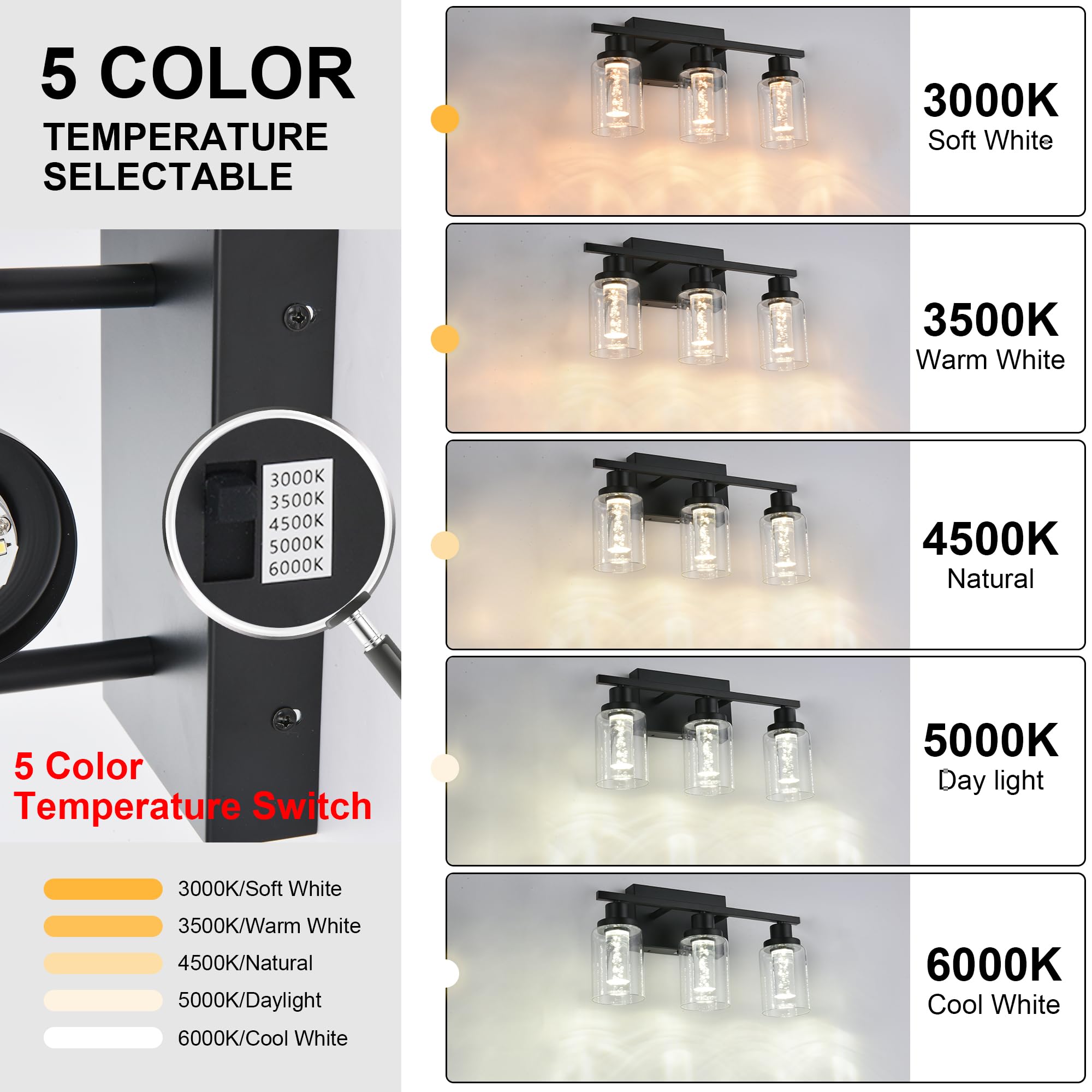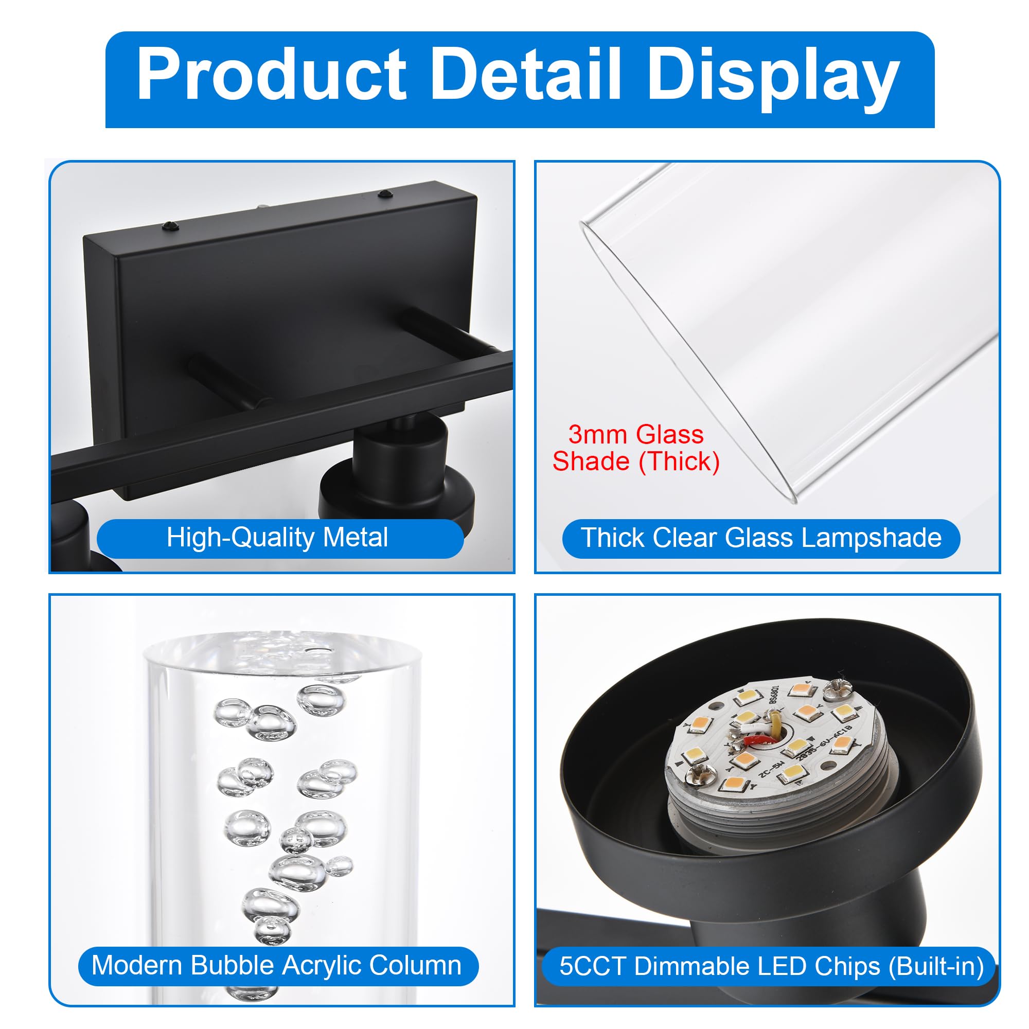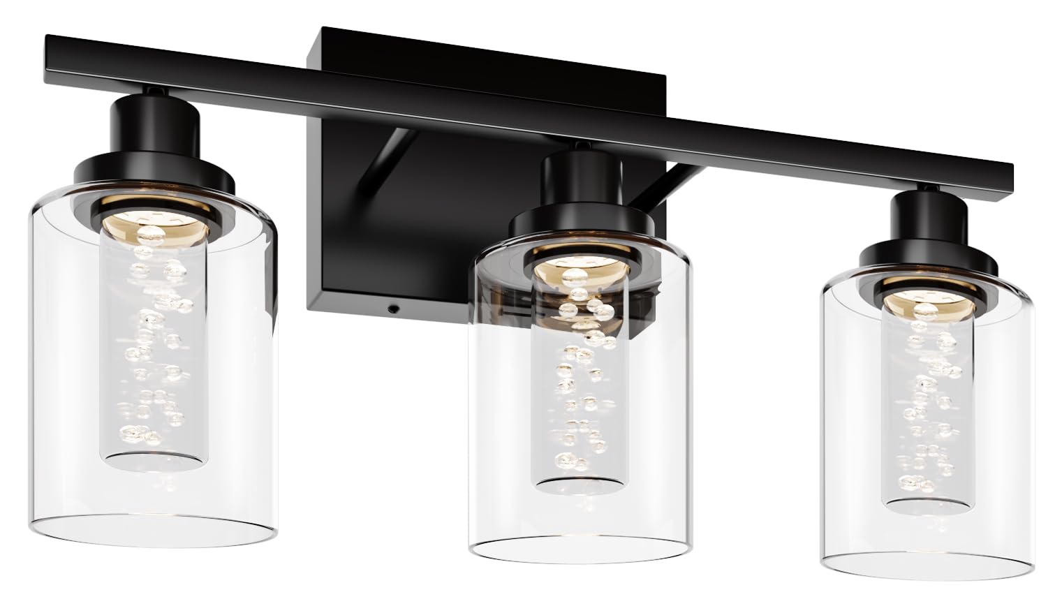MELUCEE Bathroom Vanity Light Fixtures, 3-Light LED Bathroom Lighting Fixtures Over Mirror, 3000K-6000K Modern Black Vanity Light for Bathroom with Crystal Bubble Glass Shade, Built-in LED Chips