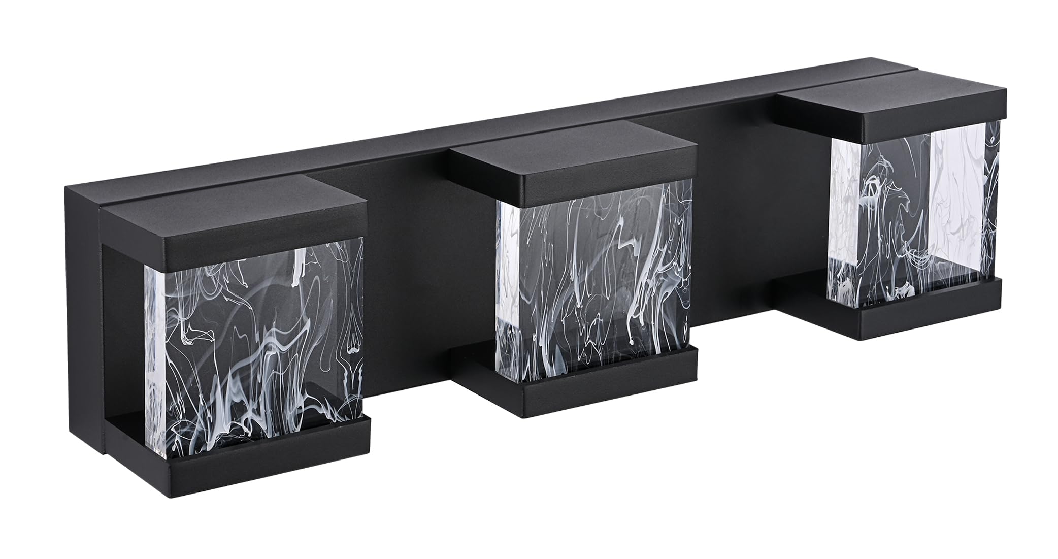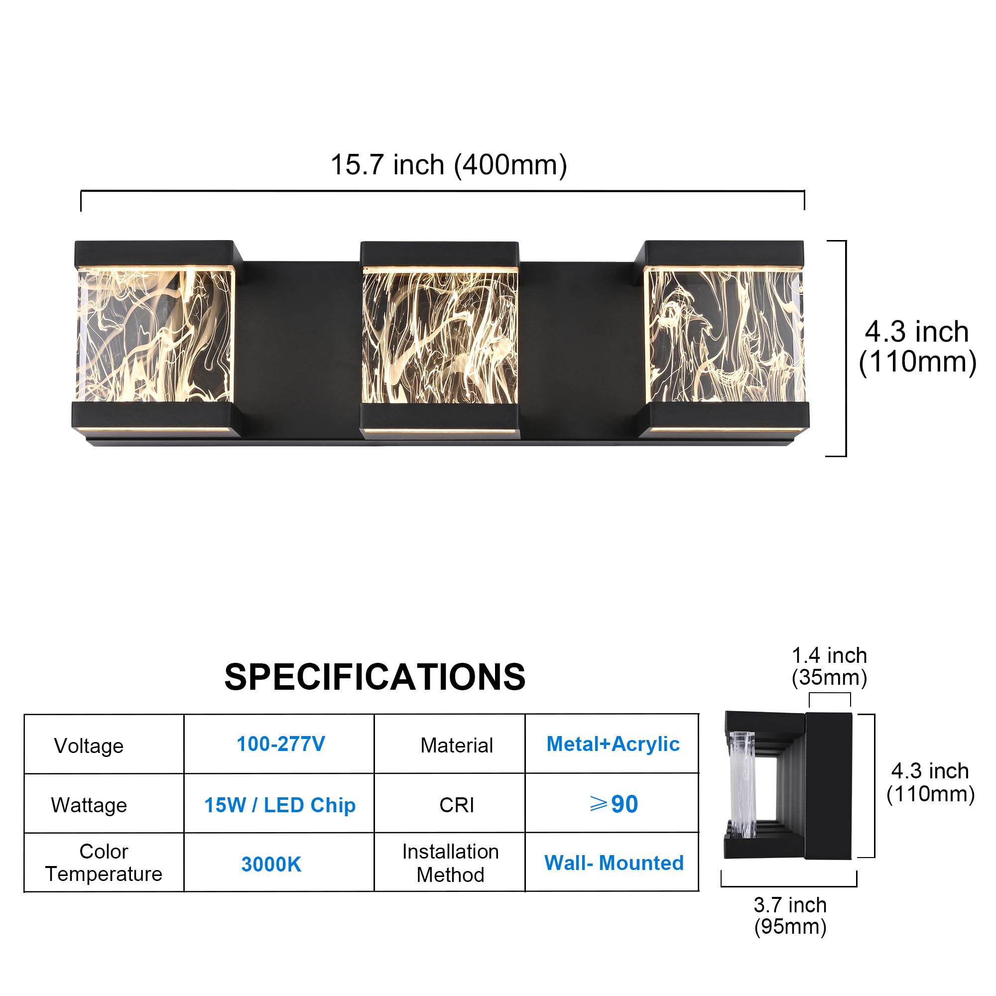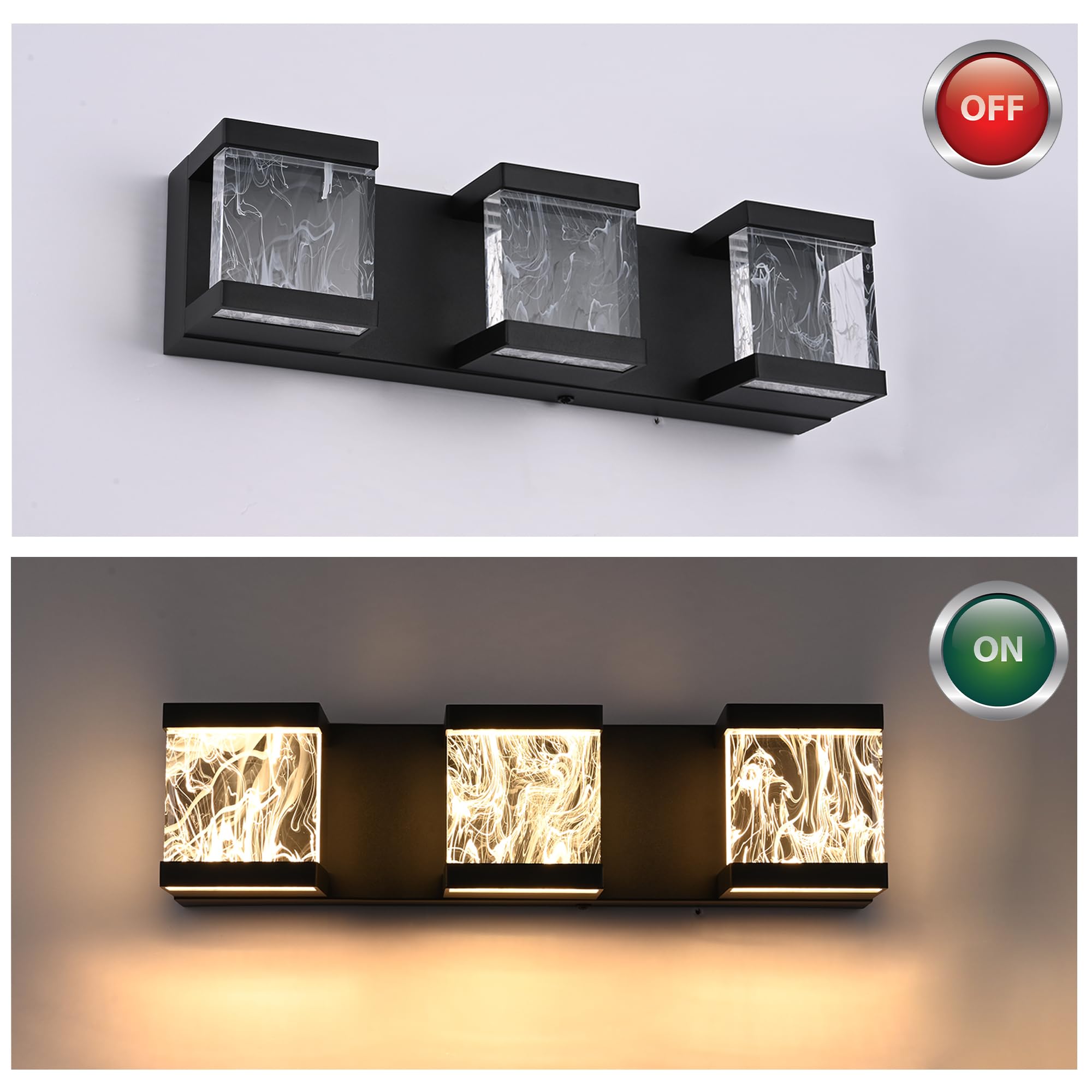 MELUCEE Modern LED Bathroom Lights Over Mirror 15W 3 Lights LED Vanity Light Bar with Unique Smoke Acrylic Panel Black Bathroom Wall Light Fixtures for Bath Powder Room, 3000K Warm Lighting